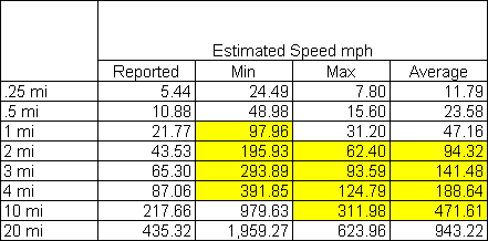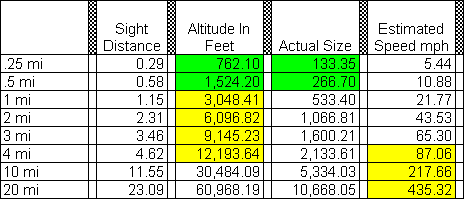 The likely envelope of aircraft sizes, altitudes and feet are shown in the yellow cells of the spreadsheet. The intersection of the parameters is shown in green. Unfortunately, the envelope does not intersect the estimated speed, even when the minimum accepted is close to a minimum safe airspeed for a light aircraft. Since the speed is the element which falls out of the envelope, perhaps it is worthwhile to attempt to constrain that number by constraining the possible duration. Elements of the event important to that include: