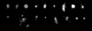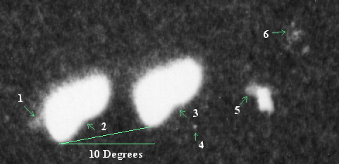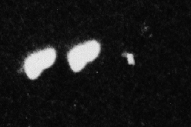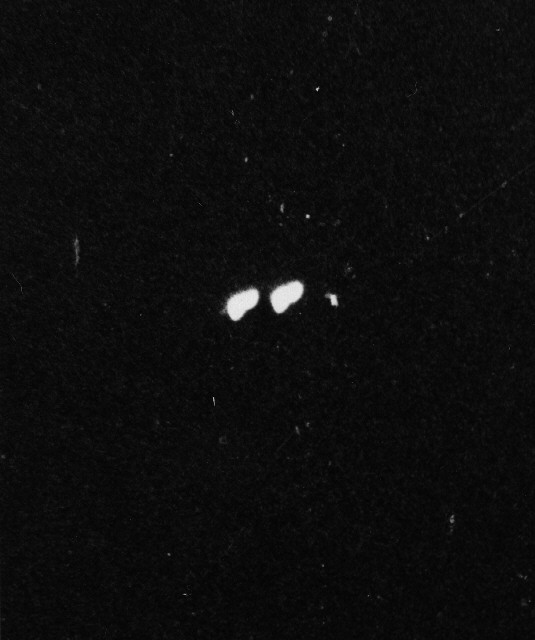 This image shows the brightest objects selected from a contrast-enhanced version of the image (selected in several strips from that image, left to right, top to bottom (not directly corresponding to rows or columns in the image above)). As you can see, the star images are remarkably circular. The most elongated objects are unlikely to be stars - they are probably marks on the print or the negative. Unfortunately, this makes it difficult to ascribe the shape of the lights on the object to camera motion. This was difficult in any event, since the right (rear) light, is elongated down and to the right, while the left lights are elongated down and to the front (assuming they are circular or ovoid in projection).