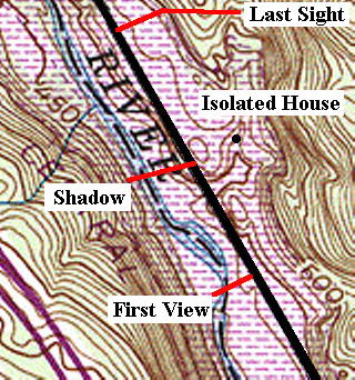 This map shows the location indicating the approximate position of the vehicle when the object was first seen, the most distant possible location of the closest edge of the shadow crossing, and the place where the object was last seen and was directly right of the vehicle. You can see that the ground stops rising at the shadow crossing point and enters a gentle downward slope. The isolated house to the right was canvassed as mentioned. Distances are as follows