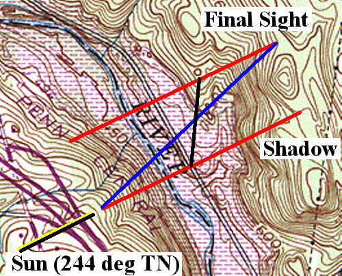 The two red lines represent the location of the object if it were traveling perpendicular to the road at the shadow location or at the final sight location respectively. The blue line is an interpolated course for a high altitude object. The black line connects the shadow crossing with the ridge crossing location.. Theoretically, the actual course could be anywhere between those two, or could even fall outside those courses. However, some sanity tests may be able to be used to constrain the course.