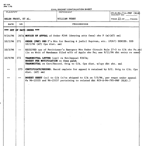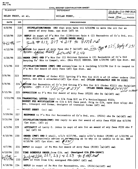 Below are docket sheets for the court case, Frost vs. Perry. A docket sheet is an index listing of motions and other documents that have been filed in the case.