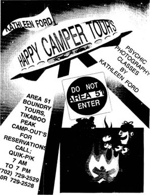 UFO photographer and Rachel resident Kathleen Ford, who has probably taken more pictures of lens reflections and military flares than anyone, is now offering Area 51 tours. Her advertised "Happy Camper Tours" of the border include "psychic photography lessons." No word yet as to price , but we are eager to hear a report from anyone who signs up.