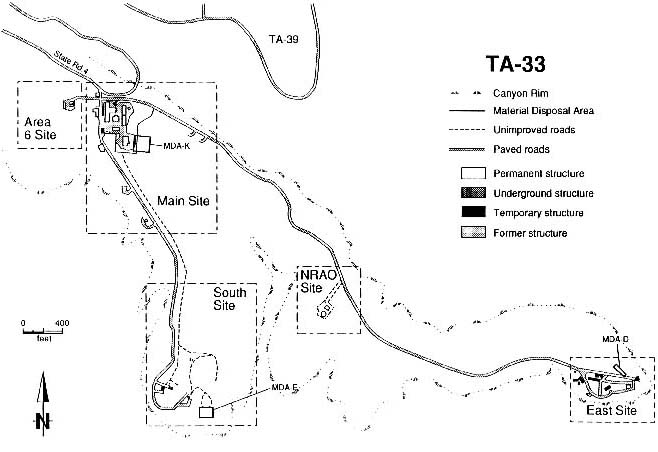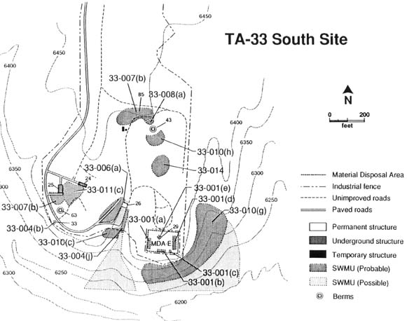 Physical Description. MDA-E lies on the mesa top and is bounded by Chaquehui Canyon and one of its tributaries. Chaquehui Canyon, in turn, drains into the Rio Grande. MDA-E itself is relatively level, although its southern boundary is only about 50 to 60 ft from the cliff face. The MDA is surrounded by an 8 ft fence. The surface rock has been highly disturbed by the construction of an experimental chamber and six waste pits. There are piles of soil and broken tuff throughout the fenced area.East Site. According to the report, two underground chambers, both about 30 feet below ground, were excavated at East Site in 1948 and subsequently destroyed in Tests. On the map of East Site, the former shafts are the circles marked as 33-003(a) and 33-003(b) in the area designated MDA-D, which is described as follows:Historical Use and Potential Contaminants. Work began in November 1949 on the construction of TA-33-29 (underground Chamber #3). It was completed in February 1950. The chamber shaft was a 6 x 8 x 48 ft deep, with an octagonal test chamber to one side. This chamber was 14 ft in diameter, 11 ft high, and had 2-ft-thick concrete walls, floor, and ceiling. Testing in Chamber #3, SWMU 33-001 (e), involved explosives, beryllium, and tungsten. This underground structure, which lies within the fenced area, collapsed during an experiment in April 1950. The residuals are still contained in the chamber.