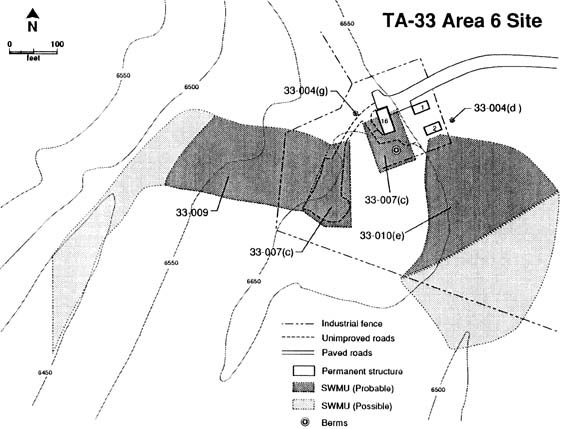 Physical Description. Shot facility SWMU 33-006(b) consists of two adjacent crescent-shaped berms, each 10 ft high and 200 ft across the face. In the center of each crescent is a concrete shot pad, TA-33-97 and TA-33-98, from west to east. SWMU 33-007(a) lies south of the berms. It is a large area, about 550 x 150-ft. Gun mounts TA-33-116 and TA-33-135 are located at the west end of the area. The mounts are concrete pads. TA-33-151 is 330 ft east of the mounts; a 25 x 35-H metal box filled with sand is adjacent to the building on the west. A narrow asphalt road nuns the length of the SWMU, as does an asphalt drainage ditch. East Site firing range is currently inactive.Historical Use and Potential Contaminants. The buildings at East Site were completed in June 1955. Gun-type, rather than implosion-type, initiators were tested. Uranium projectiles containing beryllium and polonium-210 (half-life 138 days) or cobalt-60 (half-life 5.26 yr) were used in gun tests. The projectiles were not detonated: some were shot into berms and others were shot into catcher boxes for recovery and later sectioning.
